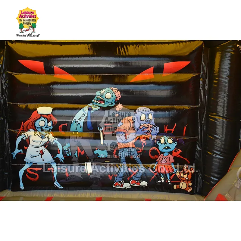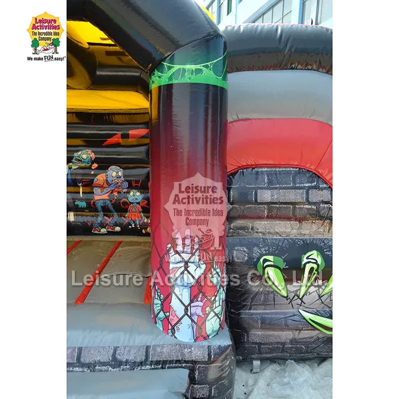 ปราสาท Bouncy แบบเป่าลมขนาดเล็กหลายแบบหลอกหลอนด้วยสไลเดอร์: แบบเป่าลม "Haunted Combo" ธีมซอมบี้นี้ออกแบบมาเพื่อดึงดูดเด็ก ๆ ด้วยสุนทรียภาพการ์ตูนสยองขวัญที่น่าตื่นเต้น การผสมผสานที่ลงตัวระหว่างสีแดงเข้ม สีดำมันวาว สีเขียวและสีน้ำเงินที่น่าขนลุก ทำให้เกิดสภาพแวดล้อมที่สดใสและน่าตื่นเต้น กราฟิกการ์ตูนซอมบี้ขนาดใหญ่ที่สนุกสนานในท่าทางแบบไดนามิก เช่น นางพยาบาล ตัวละครกินสมอง และเด็กซอมบี้กับตุ๊กตาหมี จะสนุกมากกว่าน่ากลัว องค์ประกอบแบบอินเทอร์แอคทีฟ เช่น ซอมบี้สีน้ำเงินตัวใหญ่คลานบนหลังคา มือที่มีกรงเล็บพุ่งทะลุกำแพง และโซ่/กราฟิกบนเสาที่จุดประกายการเล่นตามจินตนาการ โครงสร้างแบบปิดพร้อมฝาครอบป้องกันด้านบนช่วยป้องกันร่มเงาและฝนเล็กน้อย ในขณะที่สไลด์แบบปิดช่วยเพิ่มการผจญภัย ความสูง 10 ฟุตทำให้ใช้งานได้อเนกประสงค์ทั้งในร่มและกลางแจ้ง เหมาะสำหรับงานปาร์ตี้ฮาโลวีน เทศกาลฤดูใบไม้ร่วง งานวันเกิดตามธีม และความสนุกสนานในสวนหลังบ้านเหมือนผี